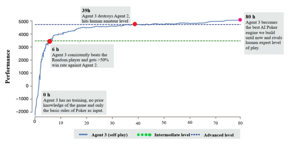 Moreover, we are introducing a new approach to learning approximate Nash equilibria with very limited prior domain knowledge, in an attempt to solve the heads-up variant. Our method combines continuous-time dynamic fictious self-play with gradient play and reinforcement learning through deep neural networks. When applied to no-limit hold’em Poker, deep reinforcement learning agents clearly outperform agents with a more traditional approach. In turn, the ones trained through self-play drastically outperformed the ones that used fictitious play with a normal-form single-step approach to the game. Finally, our best self-play-based agent learnt a strategy that rivals expert human level.